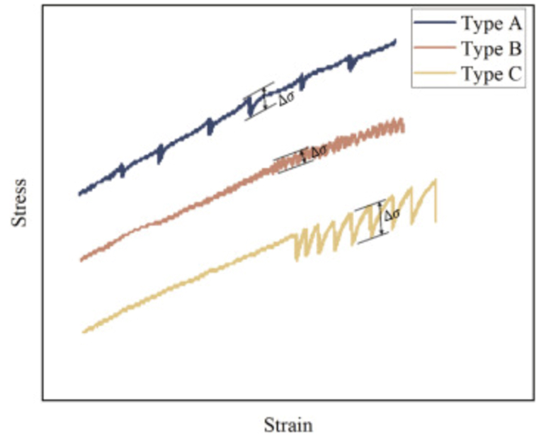 力-應(yīng)變曲線流動(dòng)鋸齒中的應(yīng)力降Δσ示意圖。