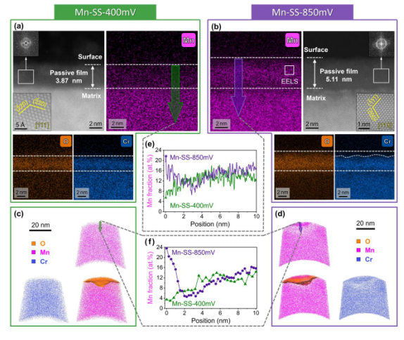 圖2 . ( a )和( b )分別為Mn - SS在400 m V ( SCE )和850 m V ( SCE )下的原子級(jí)圖像和EDS 映射。Mn - SS的( c和d) 3D - apt分別為400 m V ( Sce )和850 m V ( Sce )。( e )和( f )對(duì)比STEM - EDS和3D - APT中樣品在400 m V ( SCE )和850 m V ( SCE )下的Mn分布。