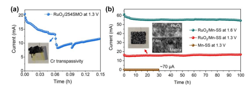 圖5 .催化劑底物在NaCl中的OER穩(wěn)定性。( a ) RuO2 / 254SMO電極在1300 m V ( SCE )下的恒電位穩(wěn)定性測試。( b ) RuO2 / Mn - SS電極在1300和1600 m V ( SCE )下的恒電位穩(wěn)定性測試。插入的是RuO2 / Mn - SS界面的TEM圖像,在1300 mV電壓下放置一小時(shí),顯示出鈍化膜的形成。