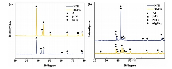 圖5 NiTi-Al-SS接頭斷裂的XRD結(jié)果:(a)能量為250J (b)能量為1250J。