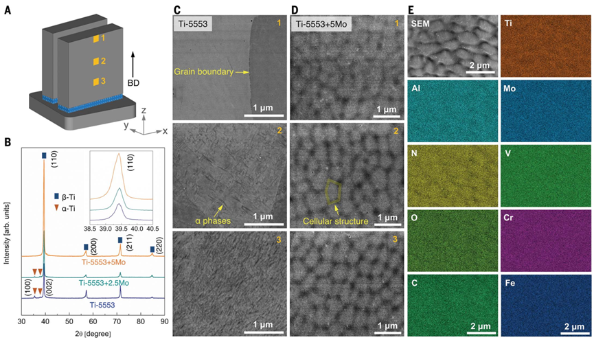 鑒于此,近日,第一作者Jingqi Zhang和Michael J. Bermingham澳大利亞昆士蘭大學(xué)Matthew S. Dargusch教授為通訊作者聯(lián)合在Science頂刊發(fā)題為“Ultrauniform, strong, and ductile 3D-printed titanium alloy through bifunctional alloy design.”的最新發(fā)現(xiàn)。研究人員展開了針對微觀結(jié)構(gòu)的設(shè)計策略。他們認識到添加特定的納米粒子可能有助于調(diào)控凝固過程中的晶粒生長和相變行為,從而改善金屬合金的微觀結(jié)構(gòu)。因此,針對激光粉末床熔融技術(shù)中存在的粗柱狀晶粒和異質(zhì)相等問題,研究人員開始探索添加納米粒子的方法。通過在金屬合金中添加鉬(Mo)納米粒子,研究人員希望實現(xiàn)晶粒細化和相變控制,從而提高金屬零件的機械性能。他們通過對模型合金 Ti-5Al-5Mo-5V-3Cr 的研究發(fā)現(xiàn),添加鉬納米粒子確實能夠促進晶粒的細化,并抑制不需要的相的形成,從而使得合金具有更加均勻的微觀結(jié)構(gòu)和優(yōu)異的機械性能。