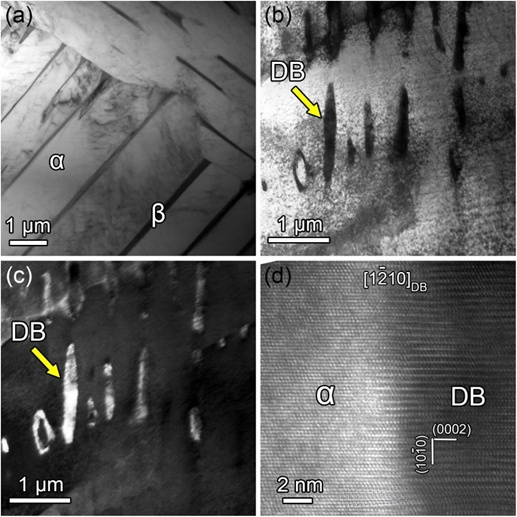 圖1 退火后全層Ti-6Al-4V合金的微觀組織和拉伸變形后DB的典型形態(tài):(a)退火后α相和β相交替分布的全層Ti-6-Al-4V合金形態(tài);(b)DB的BF TEM圖像;(c) DB的DF TEM圖像;(d)矩陣和數(shù)據(jù)庫之間接口的HRTEM圖像。