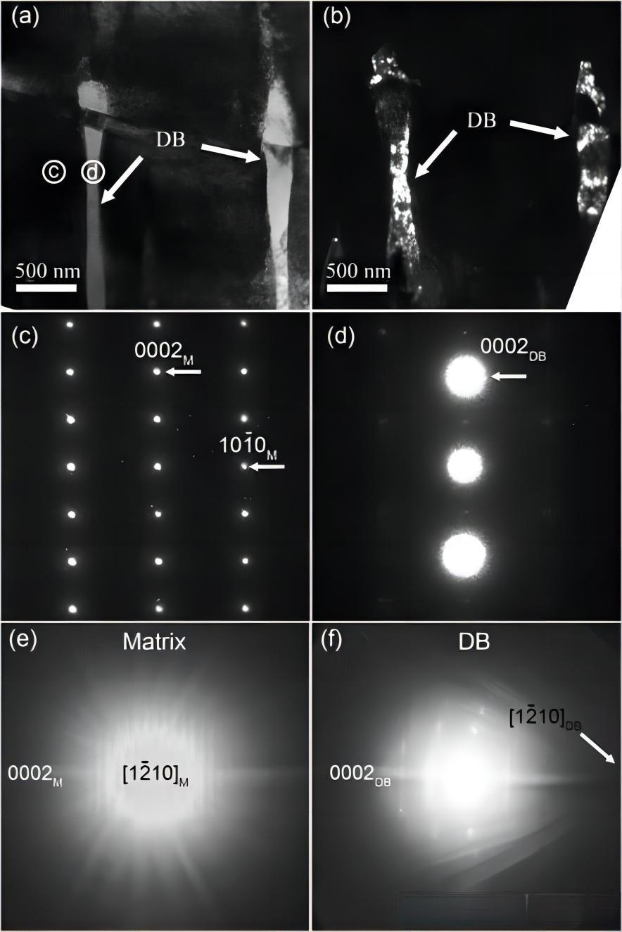 圖2 借助SAED模式和Kikuchi模式獲取的[1-210]M方向下基質(zhì)和DB的典型形態(tài):(a) DB的BF TEM圖像;(b) DB的DF TEM圖像;(c) 基質(zhì)SAED模式;(d) DB的SAED模式;(e) Kikuchi矩陣模式;(f) DB的Kikuchi模式。