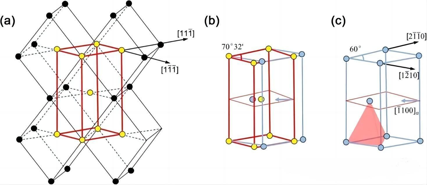 圖5 β-α轉(zhuǎn)變過程中BCC β相和HCP α相之間的三維示意晶格對應(yīng)關(guān)系。(a) β的原始三維晶格結(jié)構(gòu);(b) 從β相到α相的轉(zhuǎn)變;(c) α相的最終三維晶格結(jié)構(gòu)